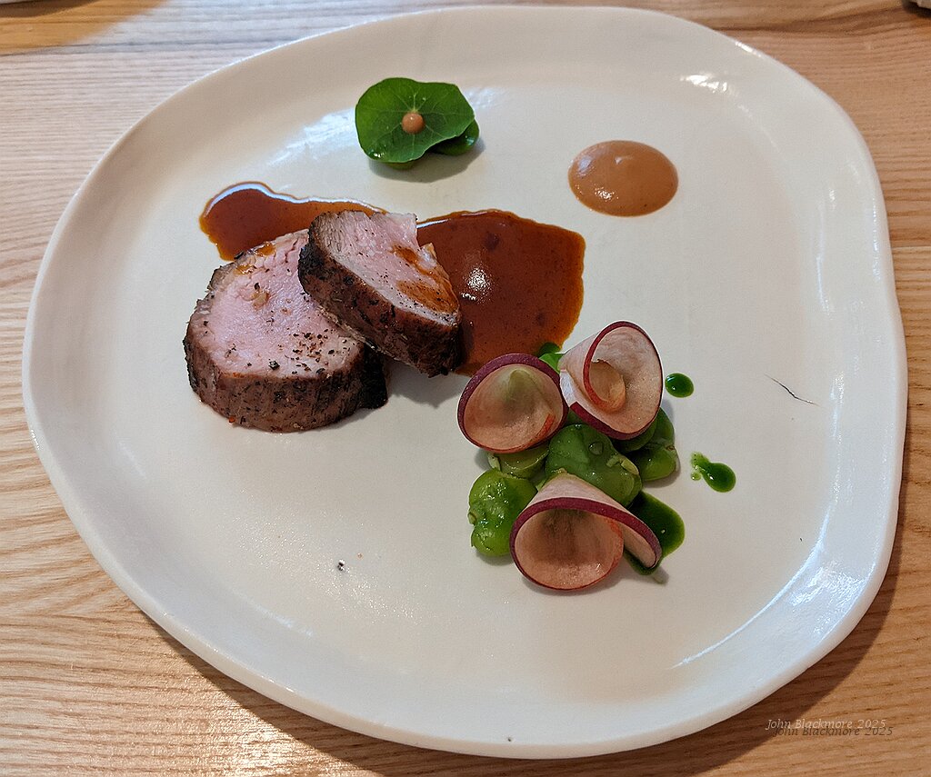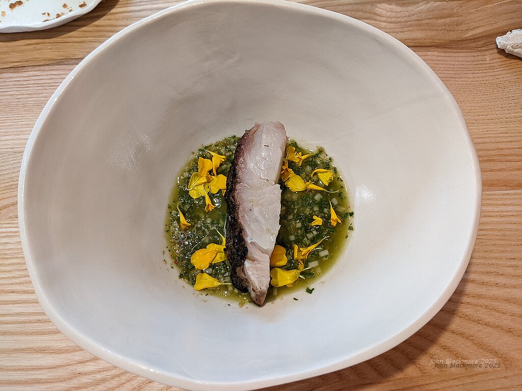John Dory cooked on skin over the fire in a sauce vierge rivière (rocket, rosemary, preserved lemon, anchovy)