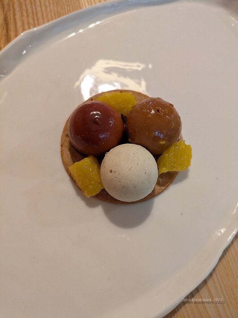 main course: glazed parsnip and deboned chicken thigh cooked over fire with cider sauce