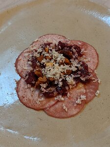 first course: tuna and beetroot strips, hibiscus juice and powder