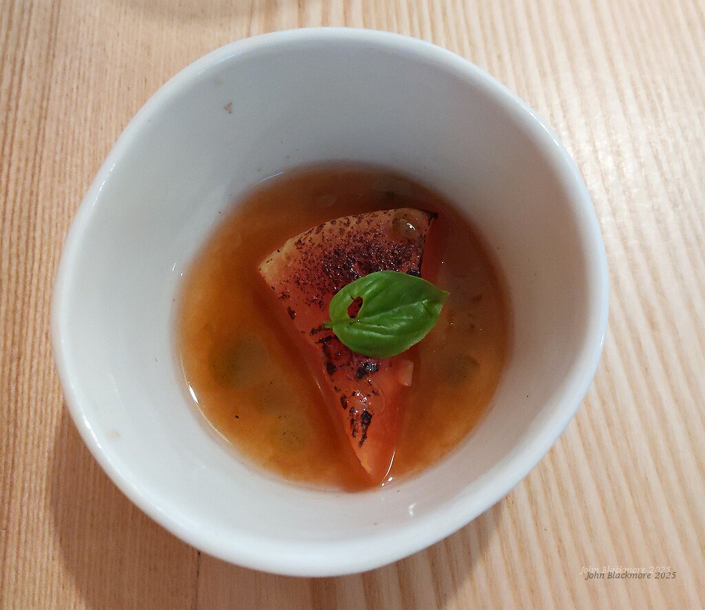 amuse bouche - cheese petal, tomato, tarragon, biscuit