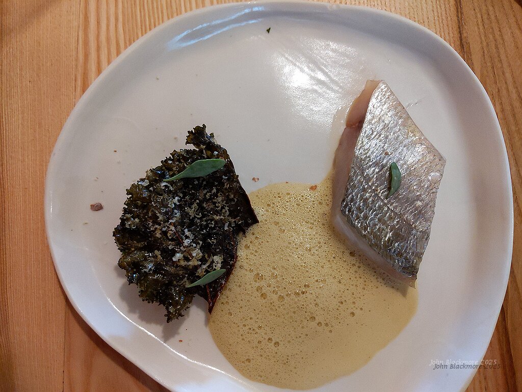 monkfish with crispy kale, Roquefort shavings, walnut and fish sauce