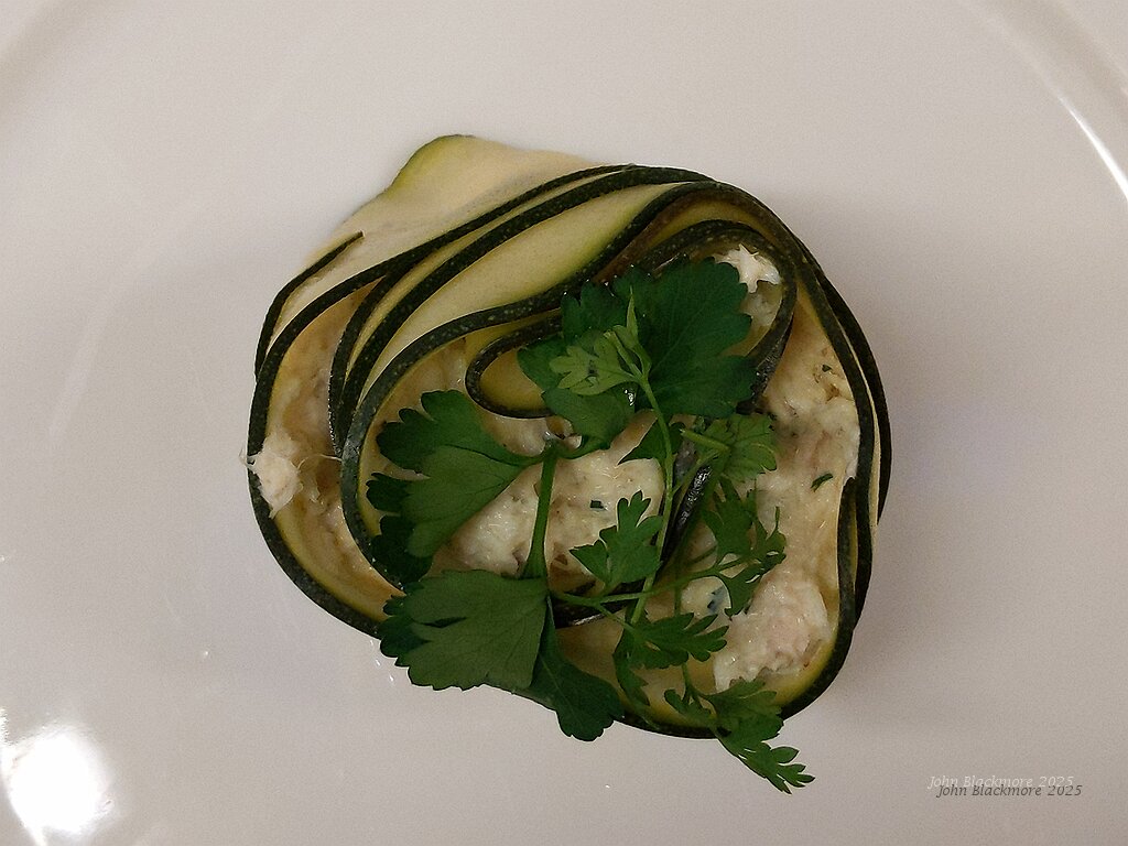 starter: Courgettes de l'été 2020 conservées au vinaigre roulées a l’émietté de poisson aux herbes