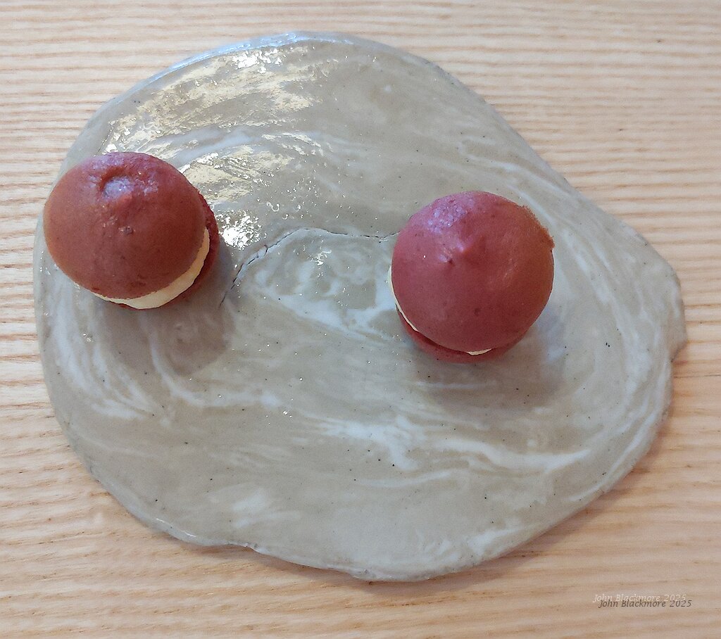 first dessert: marinaded peach, basil, blueberry jelly and beetroot macaroon