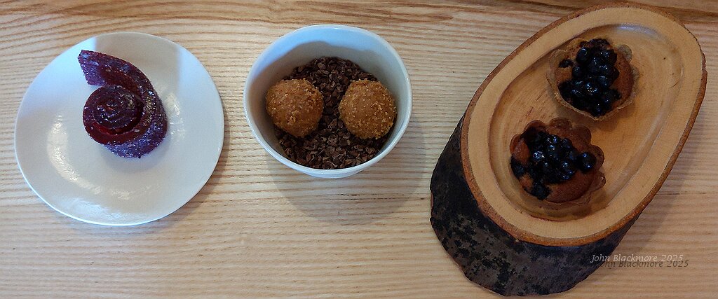 mignardises: raspberry and pepper jelly coil, filled madeleine balls, blackcurrant and almond cream tart