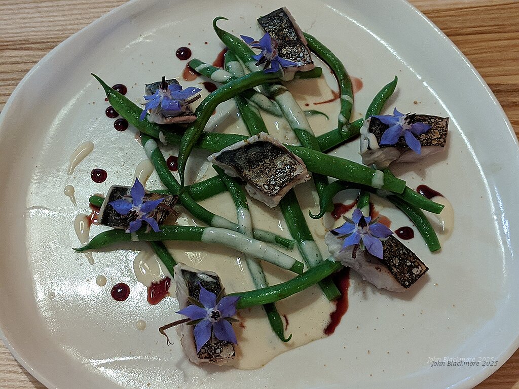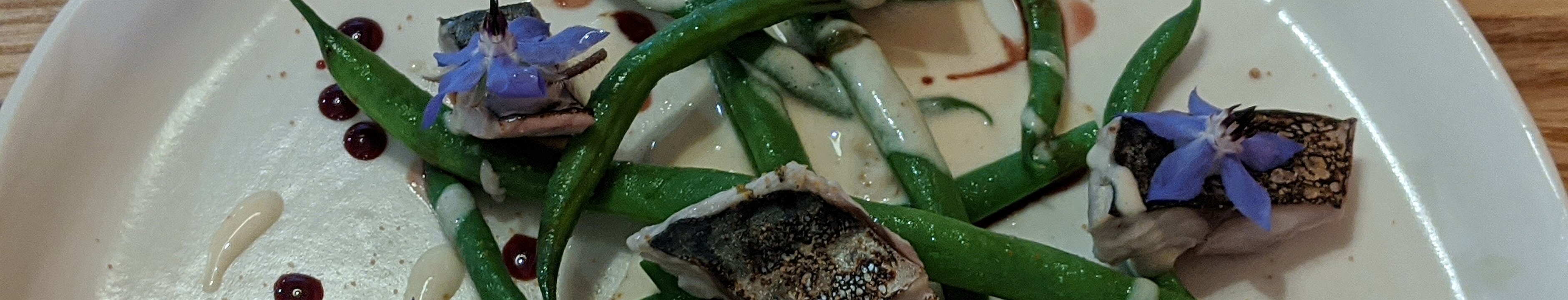 second course: Mediterranean mackerel, green beans, crème aux fleurs d'acacia, huile de cerise