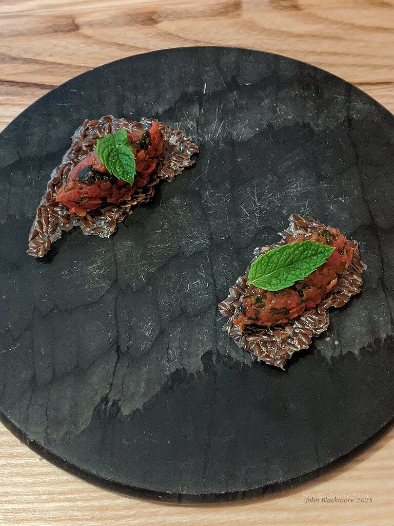 linseed tuile, tomato and basil with mint leaf