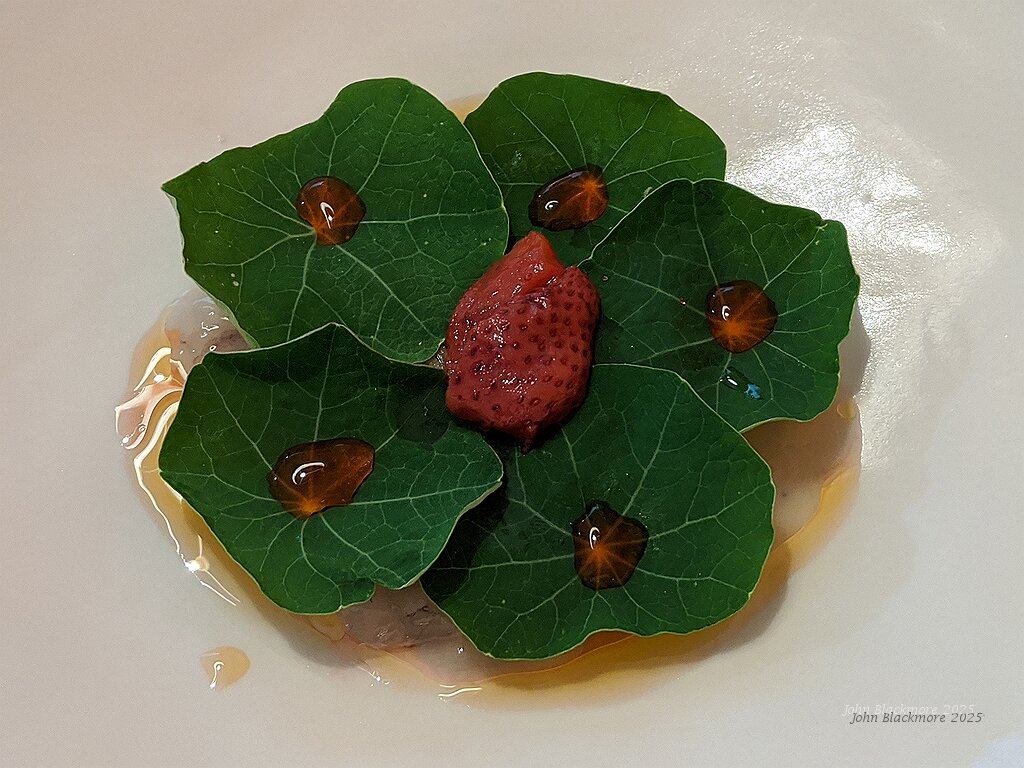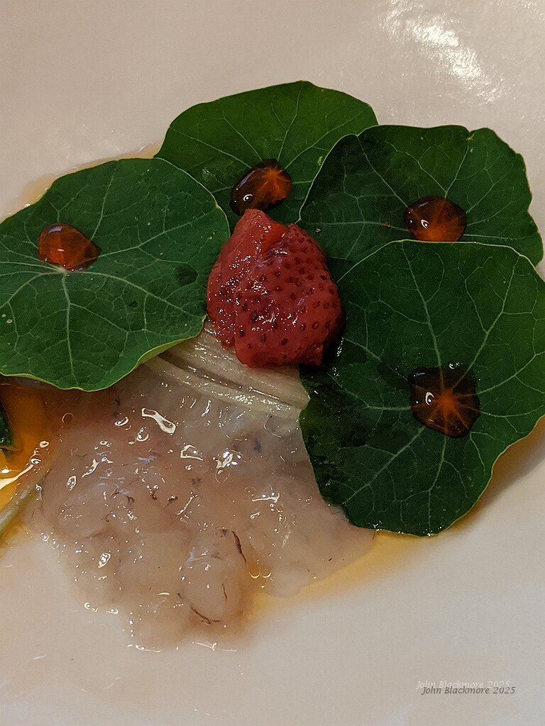 first course: squille (crevette mante sauvage), juice, pickled strawberry, nasturtium leaves