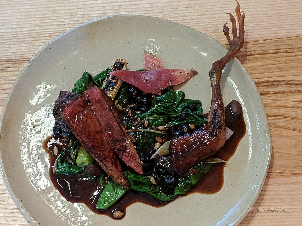 third course: fire-roasted pigeon from Saulcy, blette, myrtille vinaigre, leek