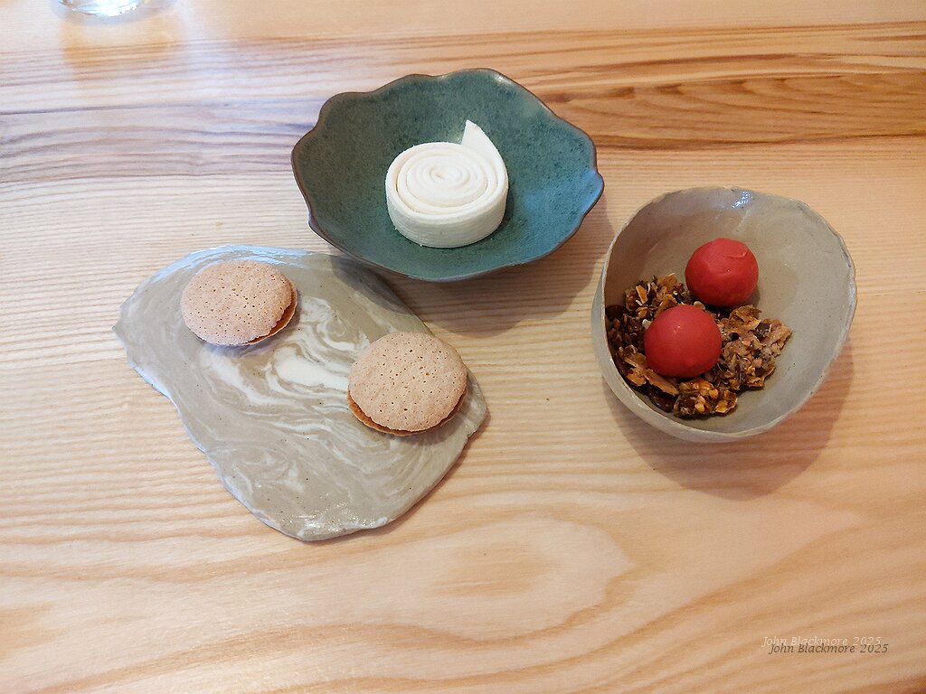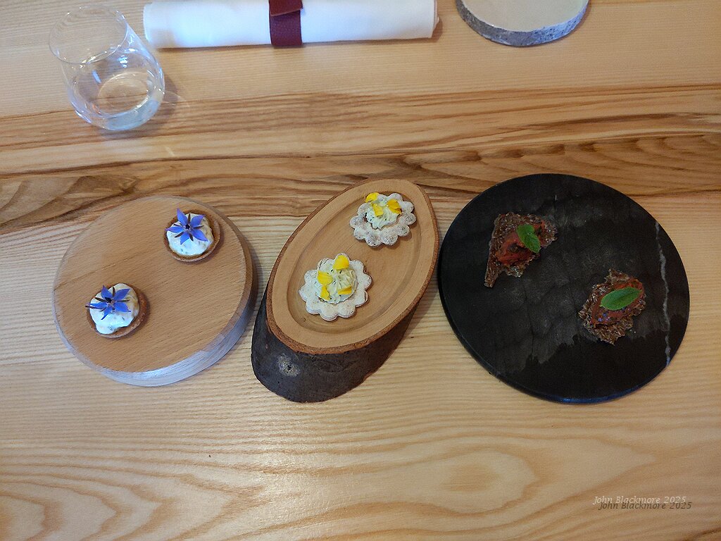 amuses bouche 1: cheese biscuit, cheese, yoghurt, borage; puffed biscuit, fromage frais, garden herbs; linseed tuile, tomato and basil with mint leaf