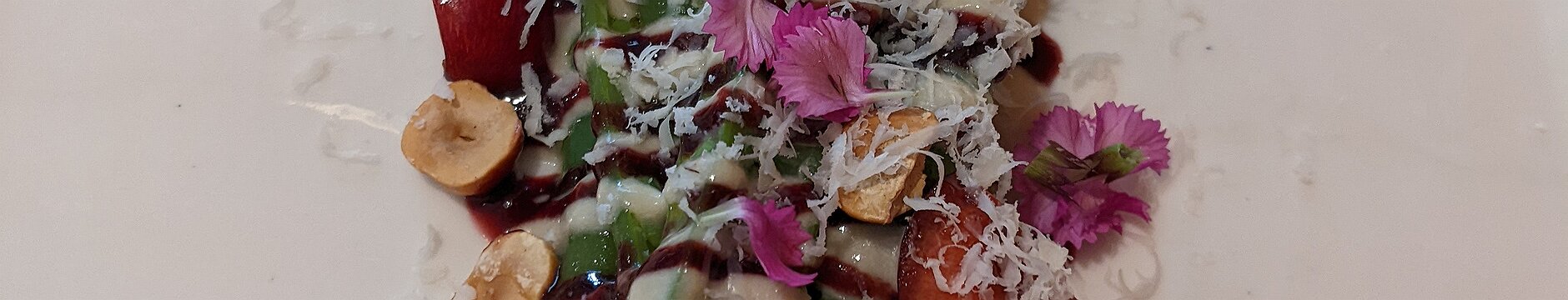 Black mullet cooked over the wood fire, cucumber à la grecque, cucumber, strawberries, strawberry coulis, nasturtium served with a yoghurt and mint sauce