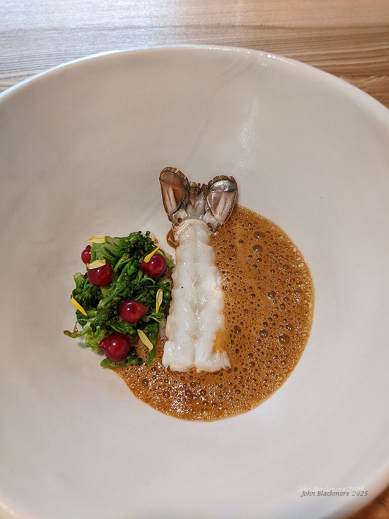Mediterranean white langoustine, red currants and broccoli, cocoa nibs sauce