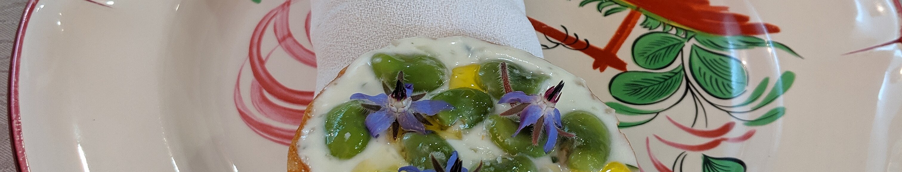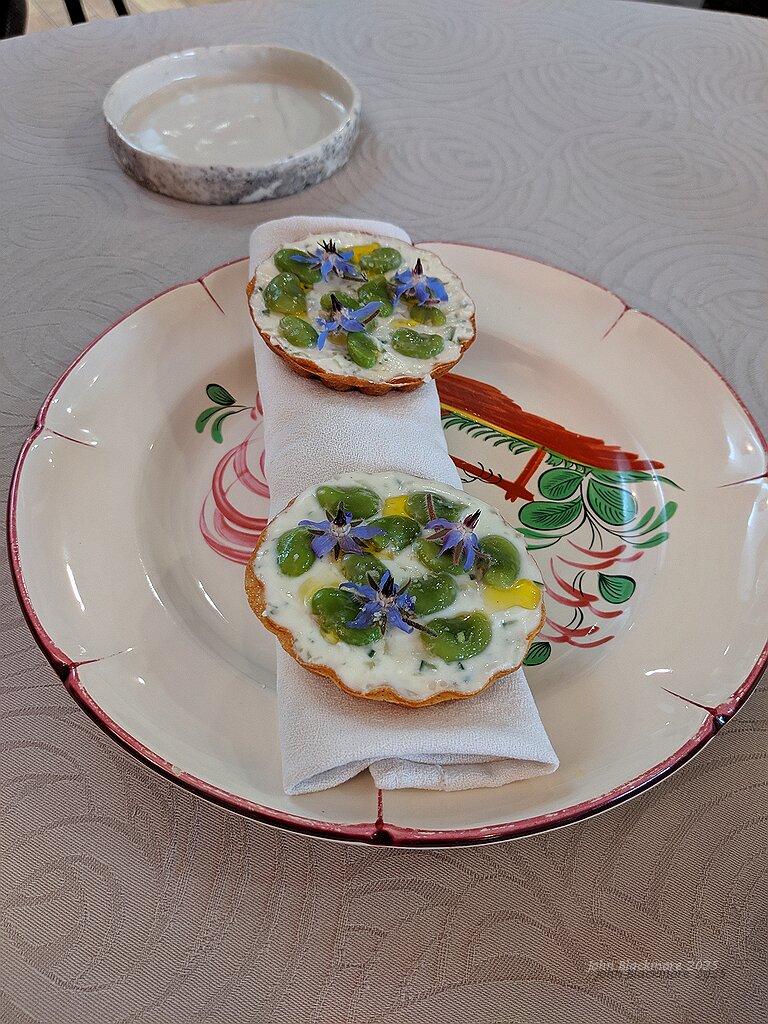 amuse bouche 1: buckwheat tartelet with cucumber cream, broad beans and borage flowers