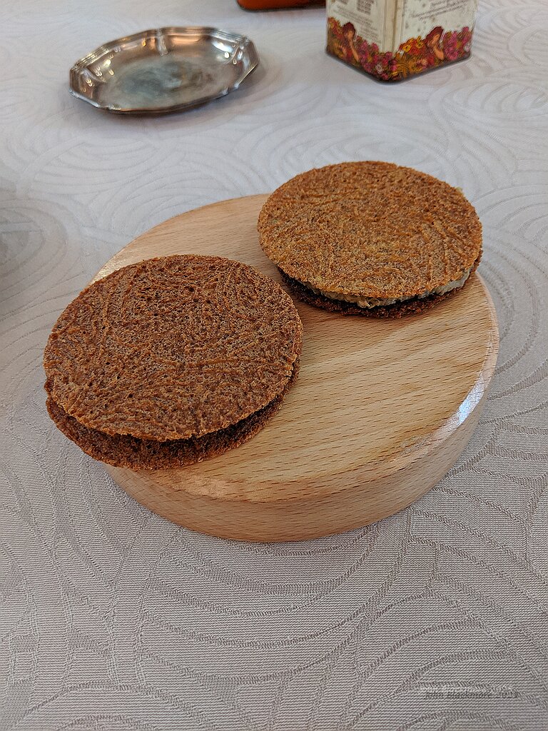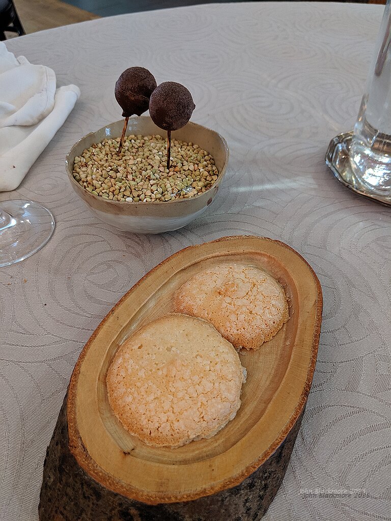 first dessert: bread and coffee cream with frozen blueberries and chocolate tuiles