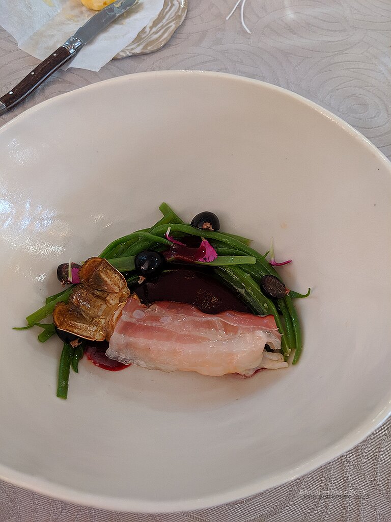 first course: Norwegian prawn with bacon, green beans and blackcurrant sauce