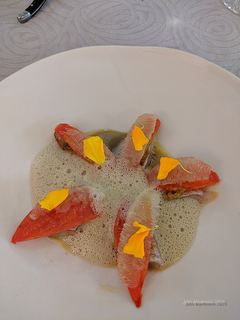 second course: red mullet under tomato and lemon and a foie gras sauce