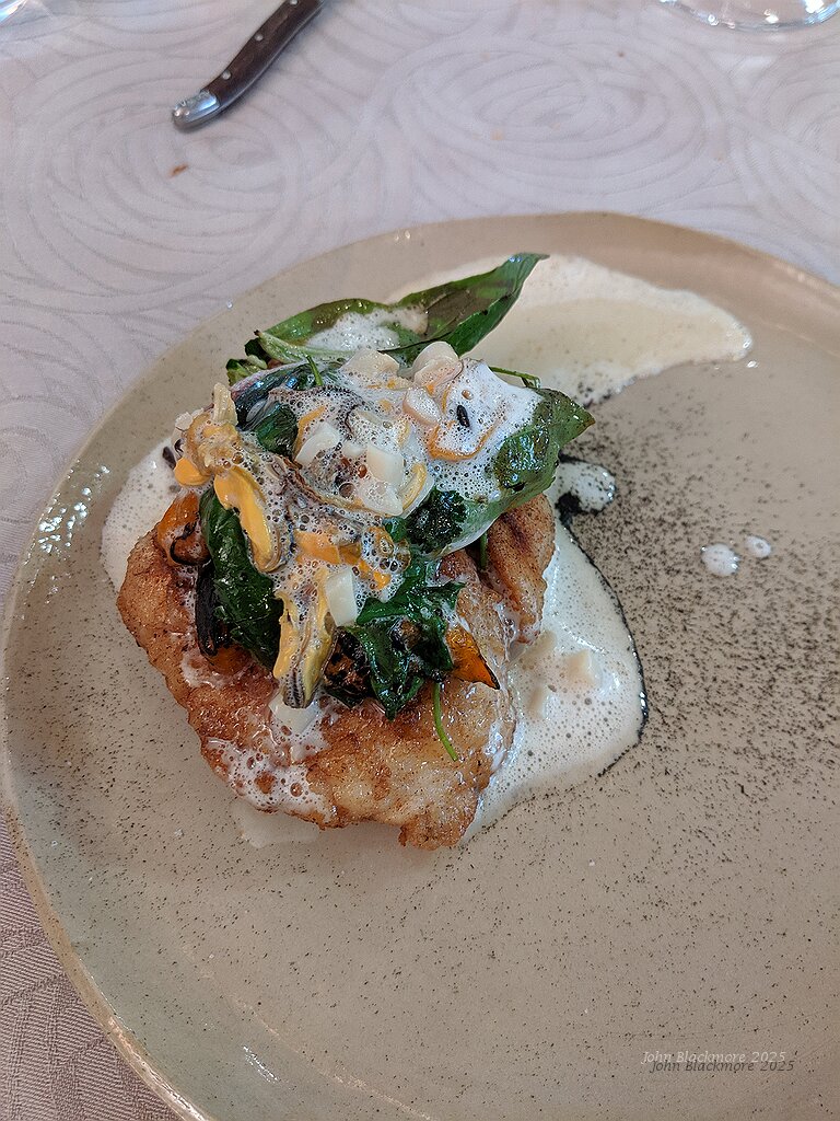 third course: apricot-stuffed veal sweetbread with basil and a cuttlefish and mussel sauce