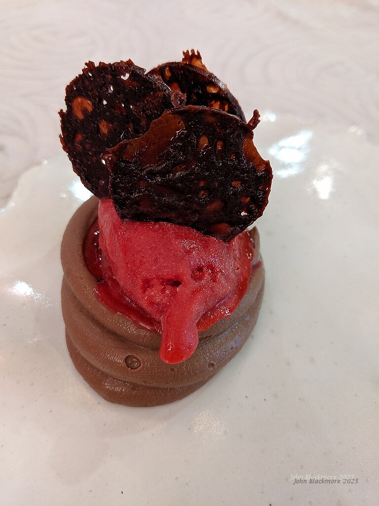 second dessert: chocolate mousse with raspberry and cayenne sorbet