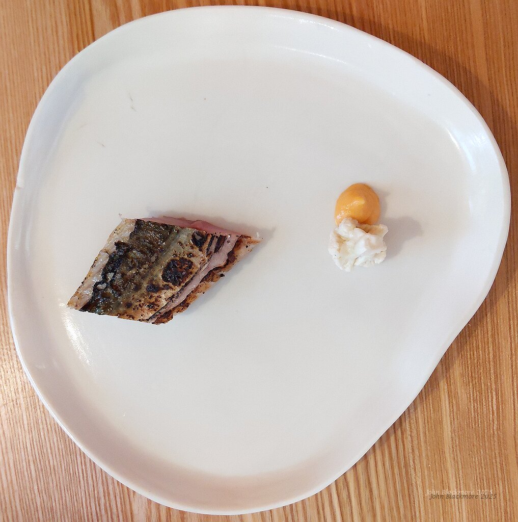 first fish course: marinaded mackerel barbecued on spruce with cauliflower