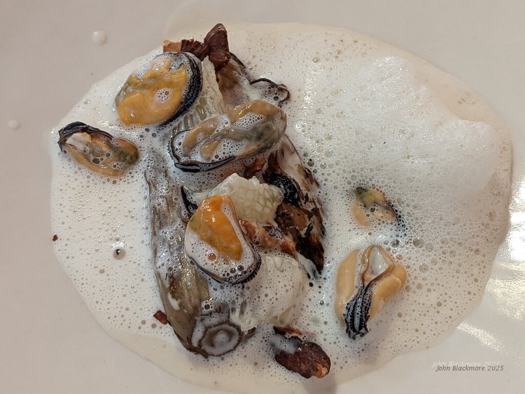 Endive, mussels, grapefruit, walnut and crème de moules