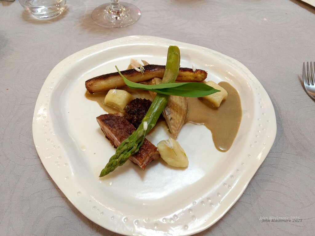 main: poulard breast roasted and confit with morel, green and white asparagus and potato gnocchi with a morel sauce