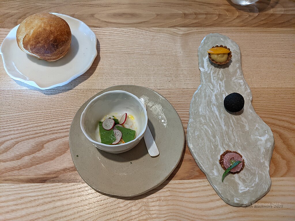 second course: Asparagus, wild garlic leaf and pickled gooseberries. with a gooseberry sauce and a goat milk and wild garlic sauce
