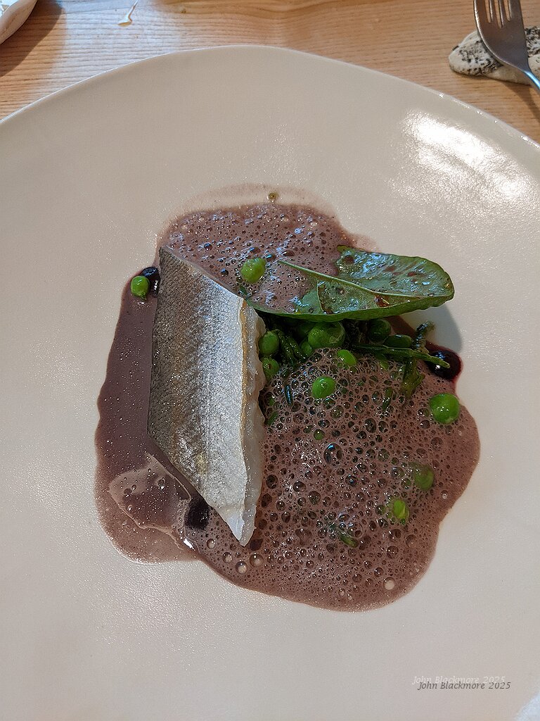 third couse: Hake cooked in seaweed butter with a blueberry sauce, peas and samphire (salicorne)