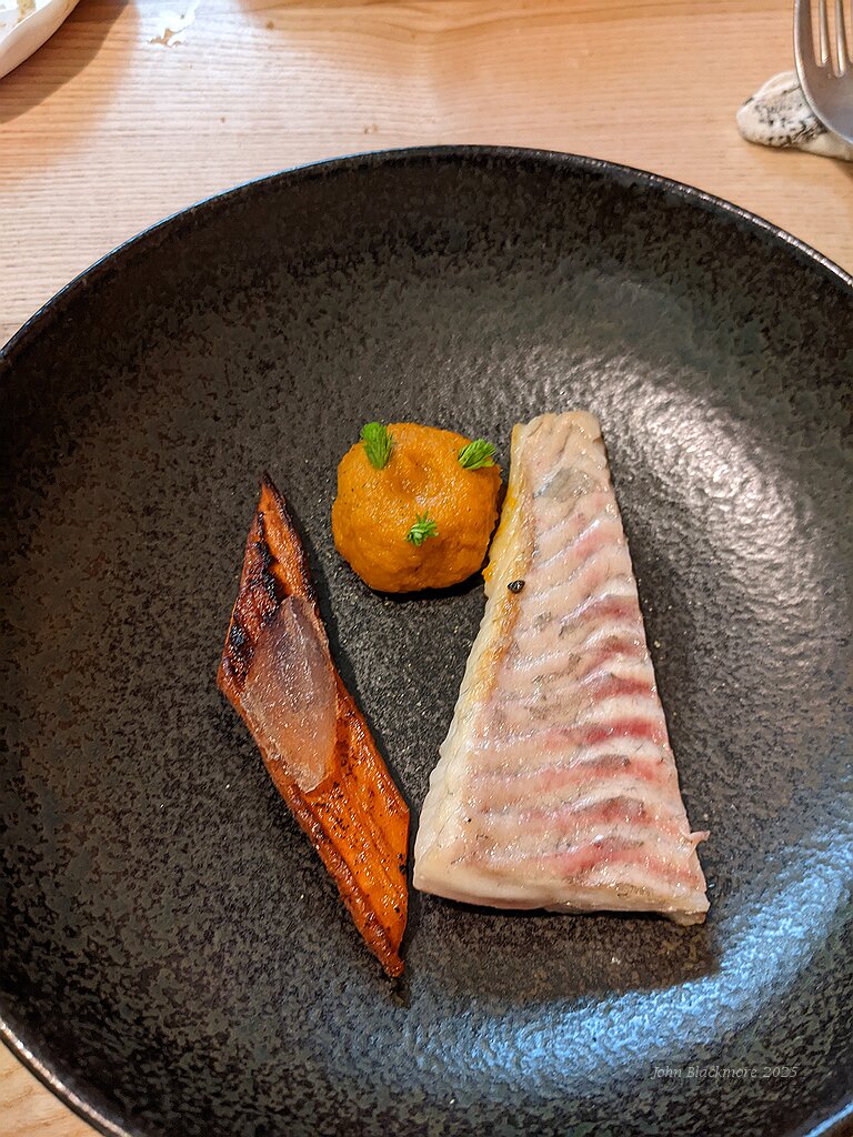 fifth course: Turbot, roast carrot and carrot purée with spruce and turbot sauce