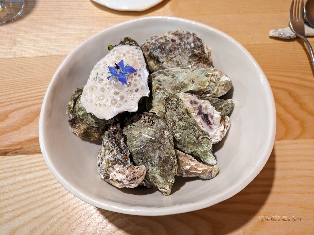 oyster from Camargue cooked over the fire with pear cider foam and pear sauce