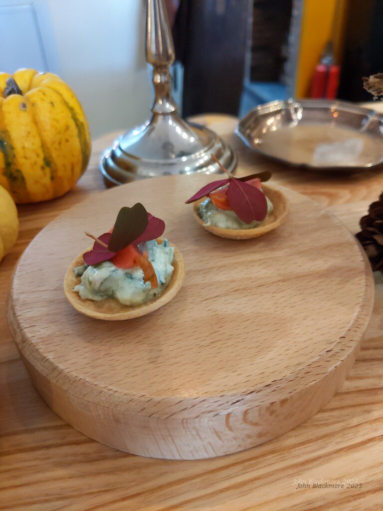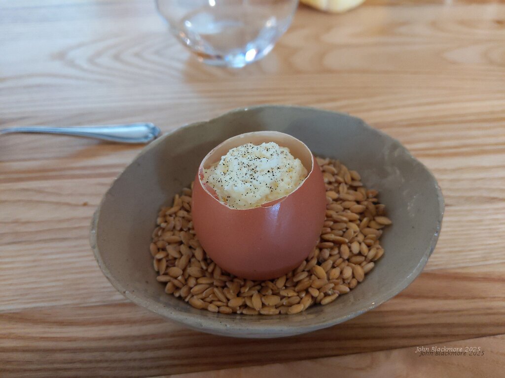 Amuse bouche: Peppered smoked cream over egg yolk and chives