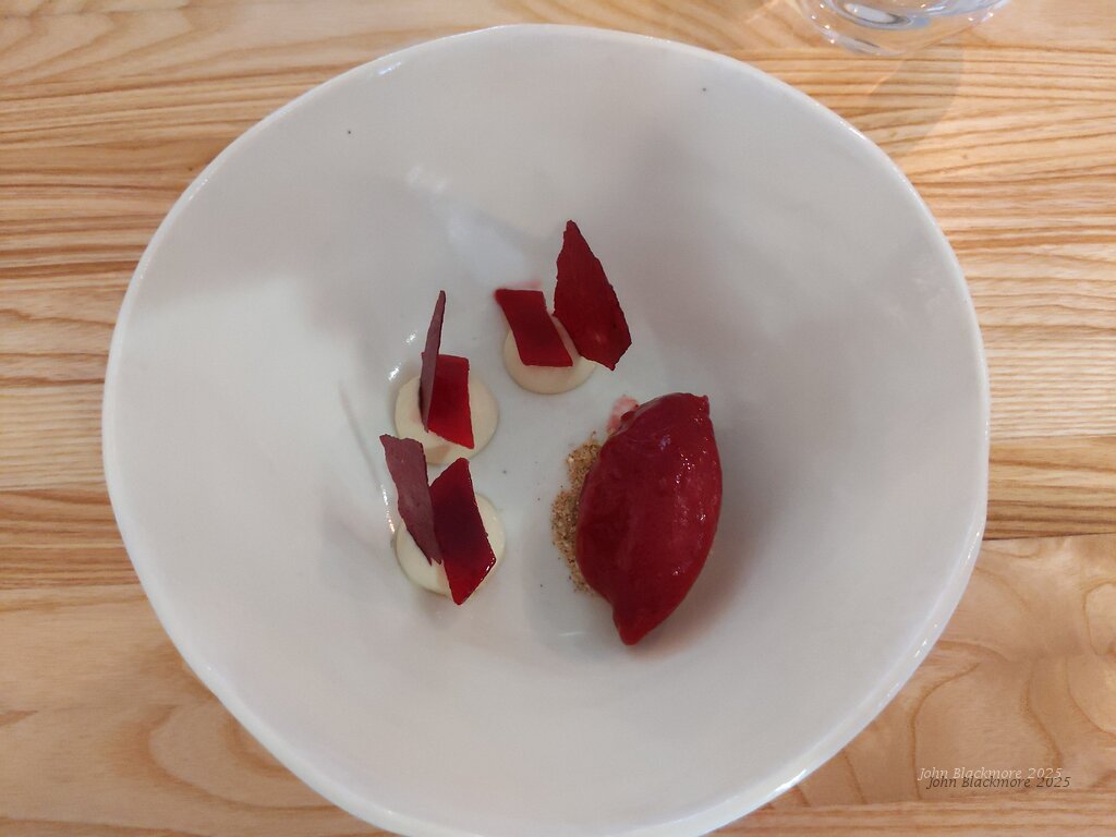 First dessert: Licorice and beetroot wafers, licorice cream and beetroot sorbet