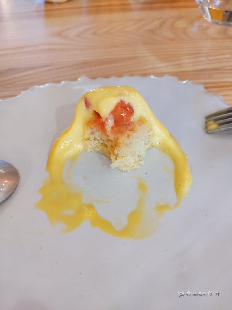 Second dessert: Meringue-topped saffron mousse over blood orange and shortbread cooked in a steam oven