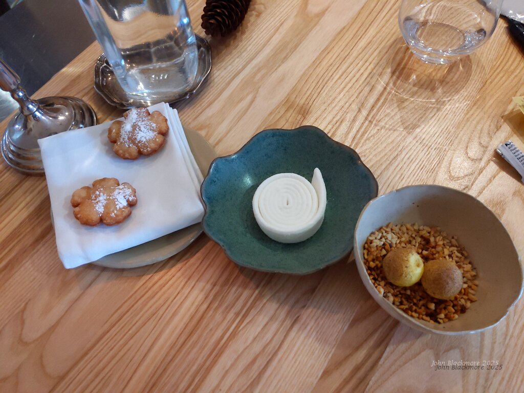 Beignets (grandmother's recipe), marshmallow, lime of Japan chocolate spheres