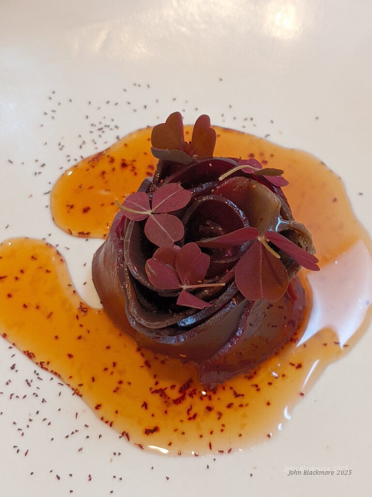 first course: tuna and beetroot strips, hibiscus juice and powder