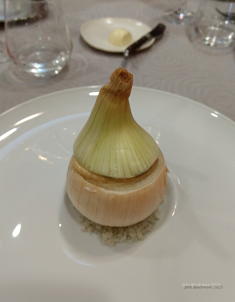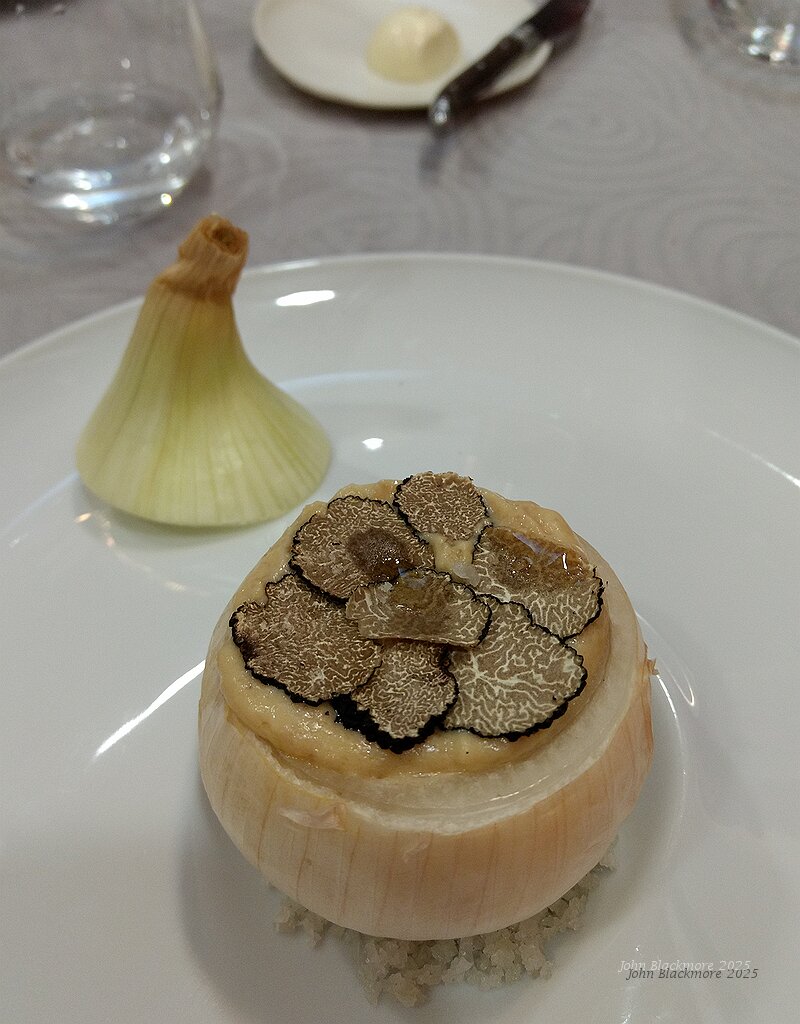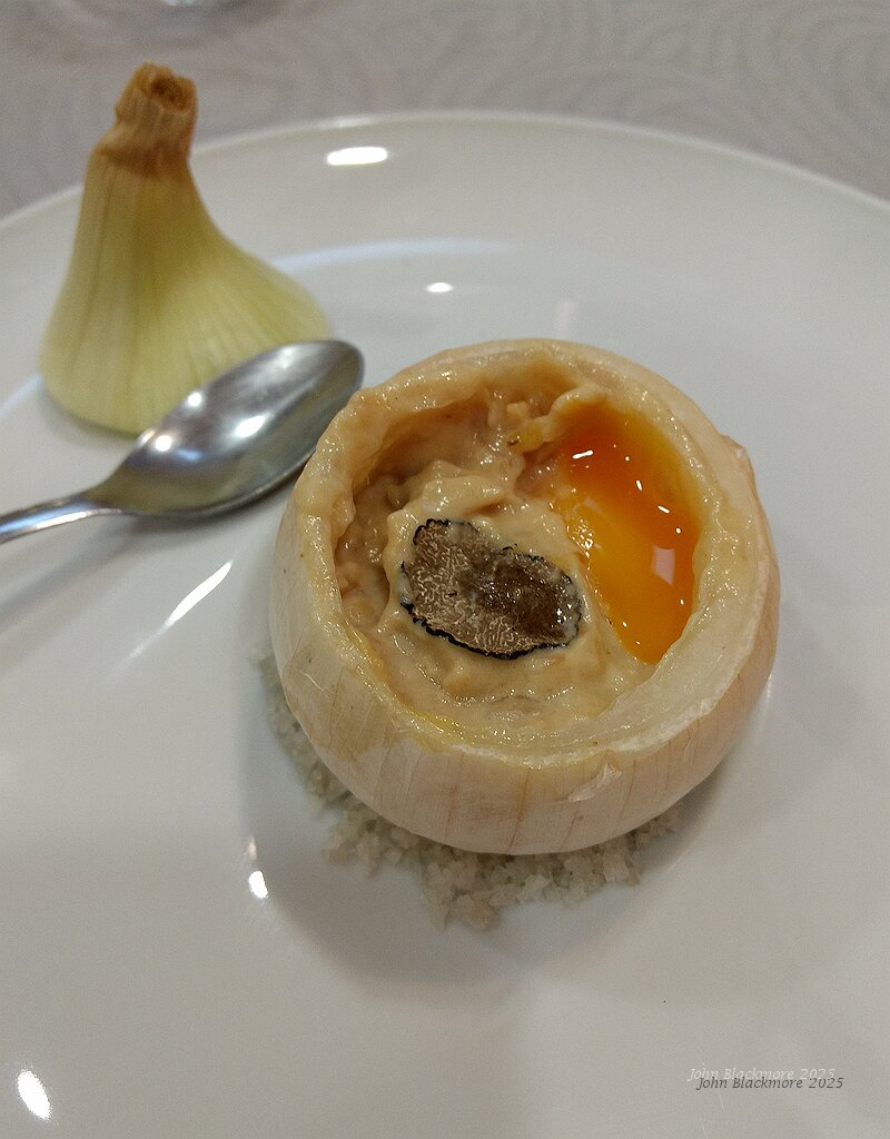 L'Oignon dans sa peau, en Soubise (as a sauce), Jaune de Poule fermier, Truffe