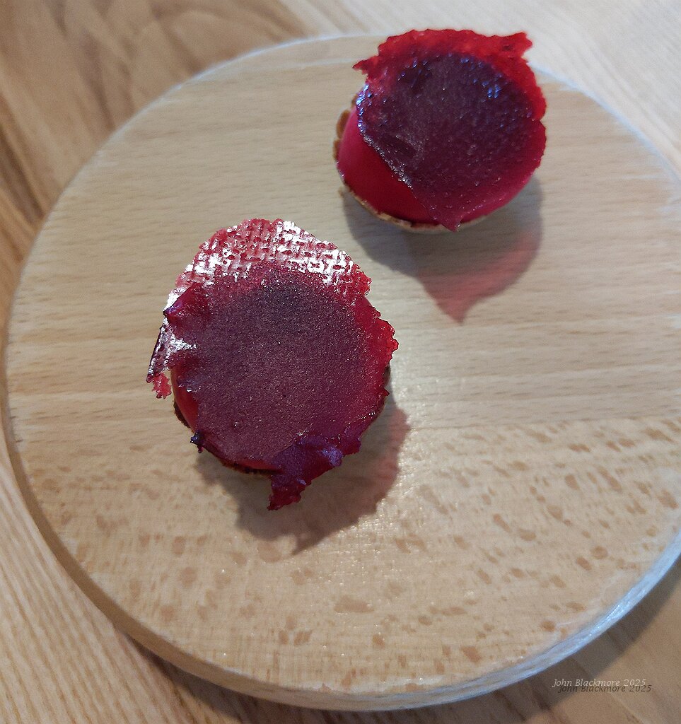 amuse bouche - buckwheat tart with beetroot cream and beetroot jelly