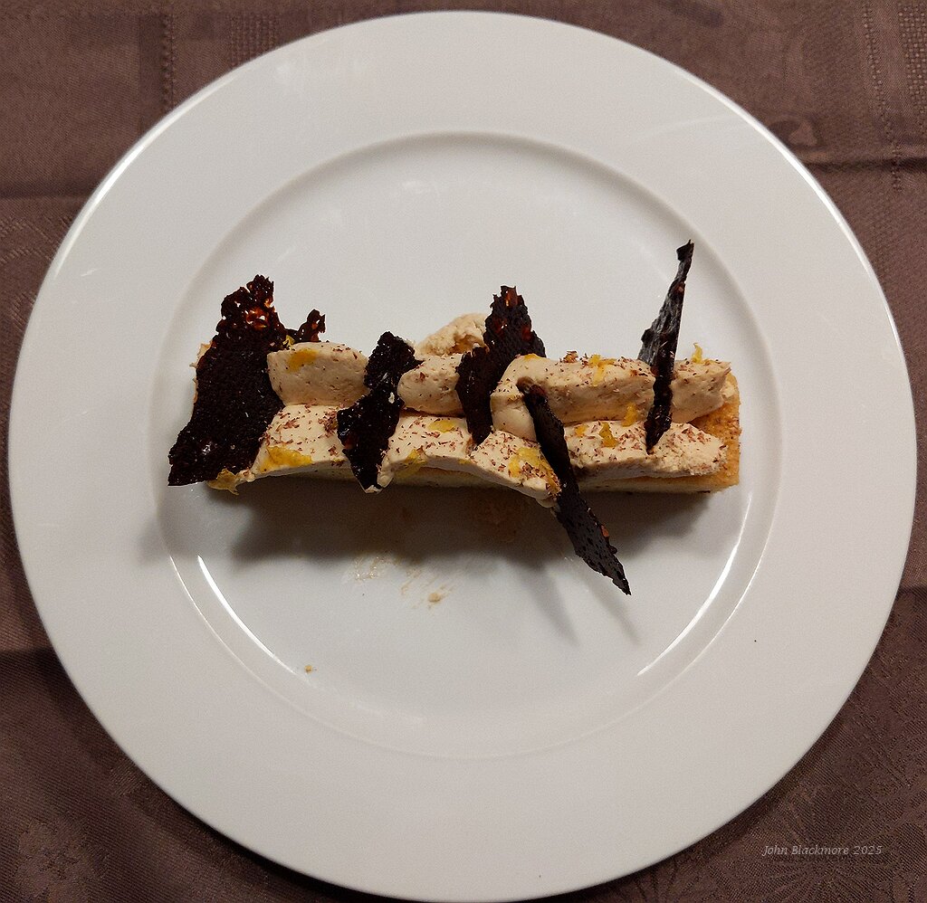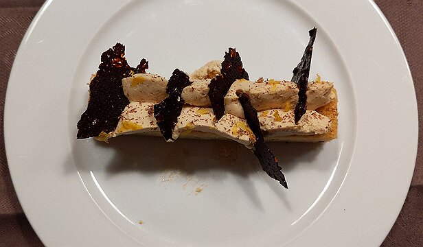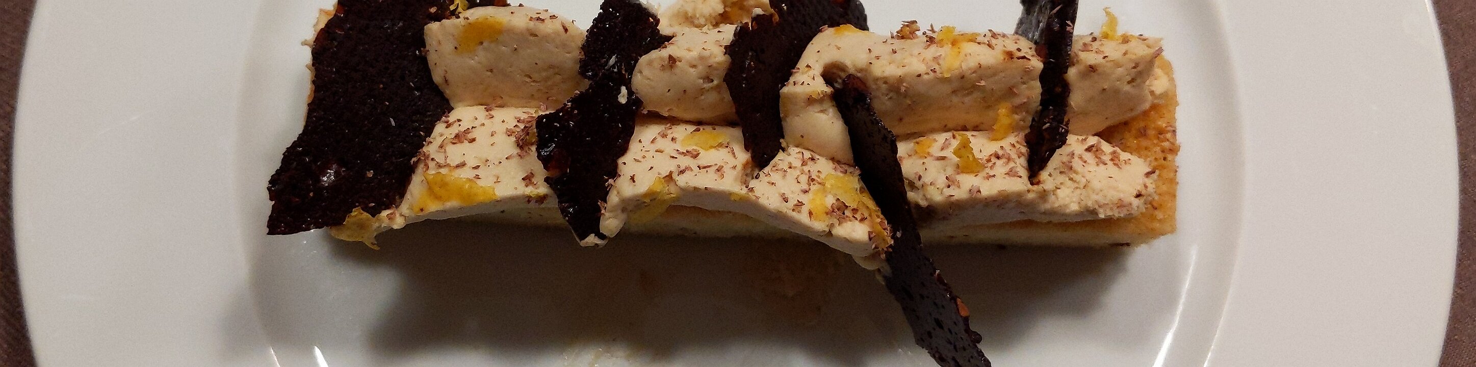 dessert: Chocolat lacté-caramel, financier citron et tuile au grué cacao