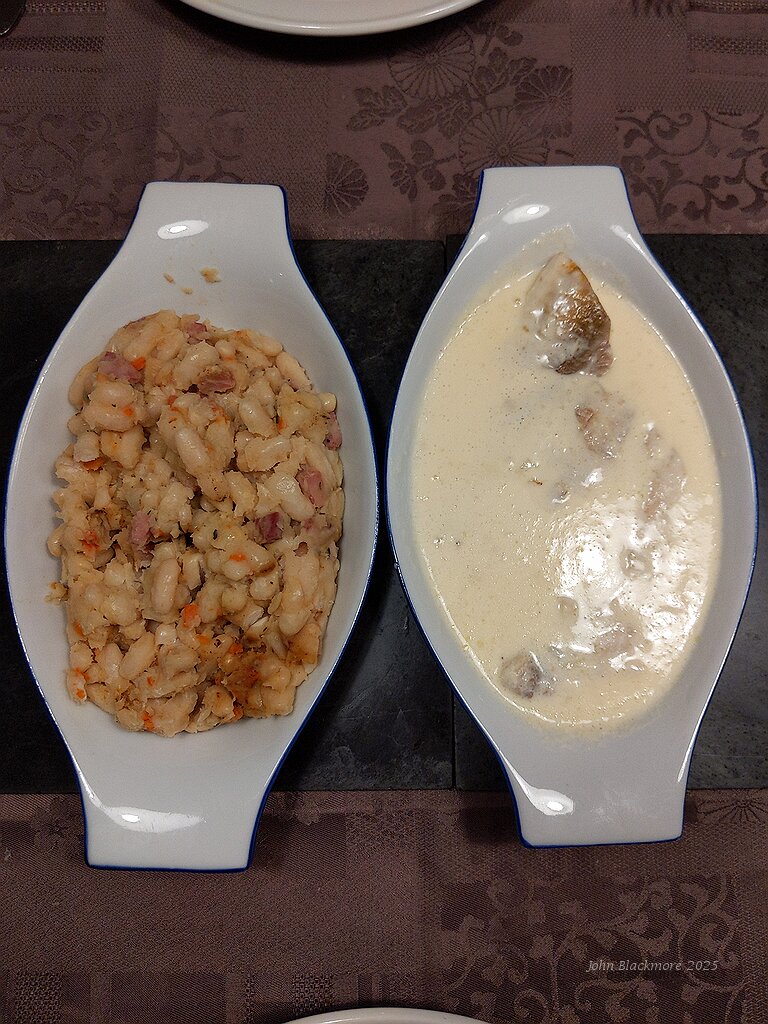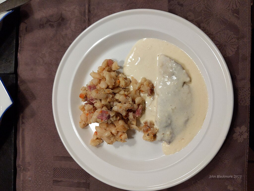 Muge de Méditerranée et tomme de Pierre Percée, coco blancs, jambon fume