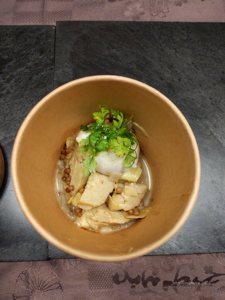 starter: Artichauts à la Grecque oeuf mollet