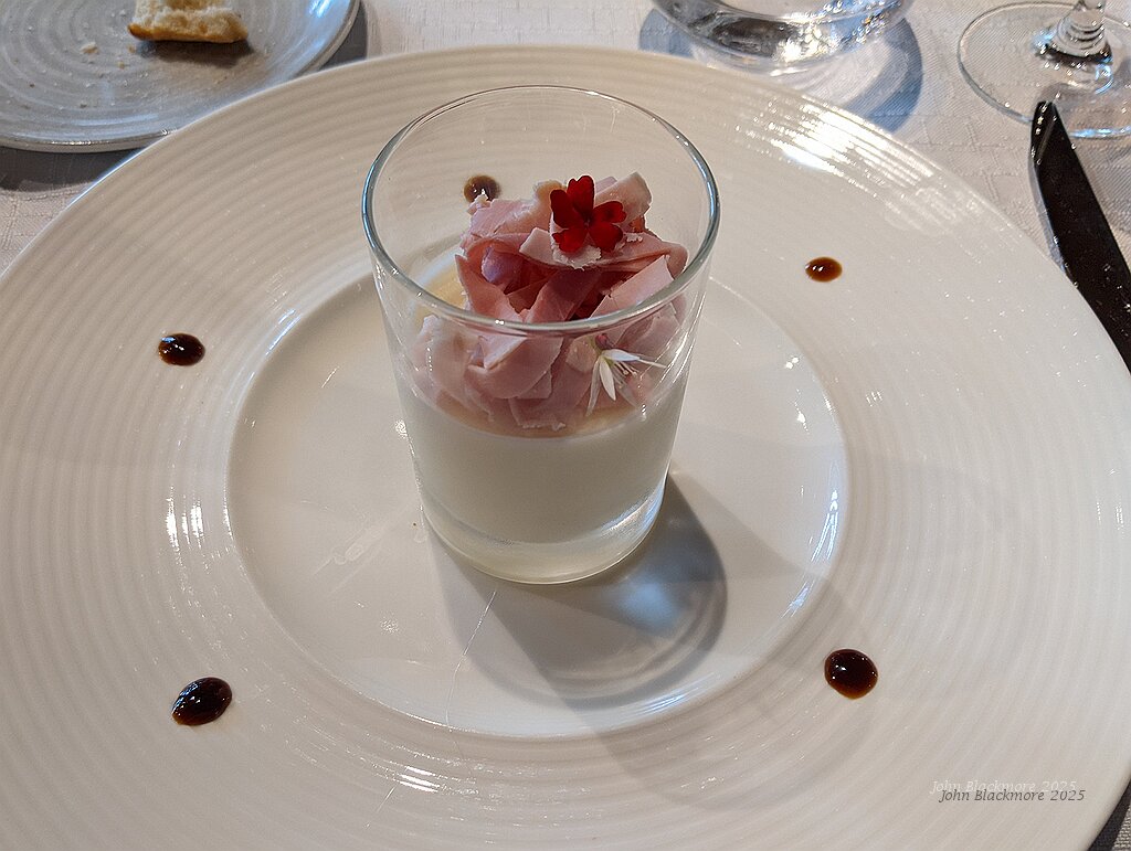 Panna cotta d'asperge, chiffonage de jambon truffé