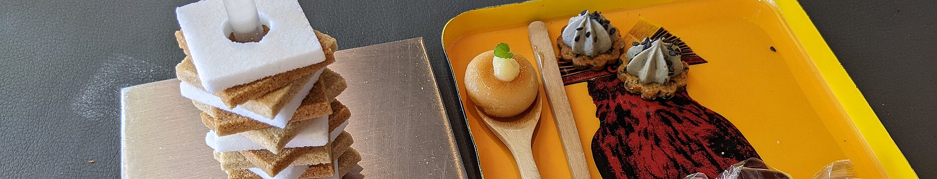 baby lemon rum babas, sesame biscuits with cream, chocolate bonbon (and sugar squares)