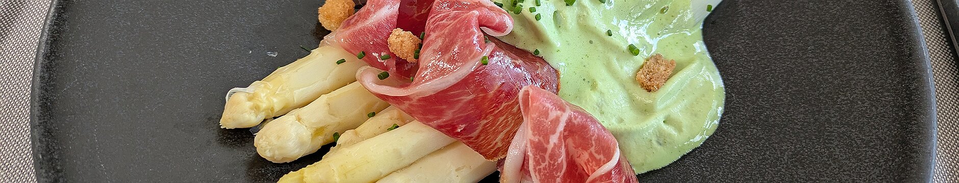 Asperges Fondantes, Jambon Ibérique, Mousseline à l'Ail des Ours