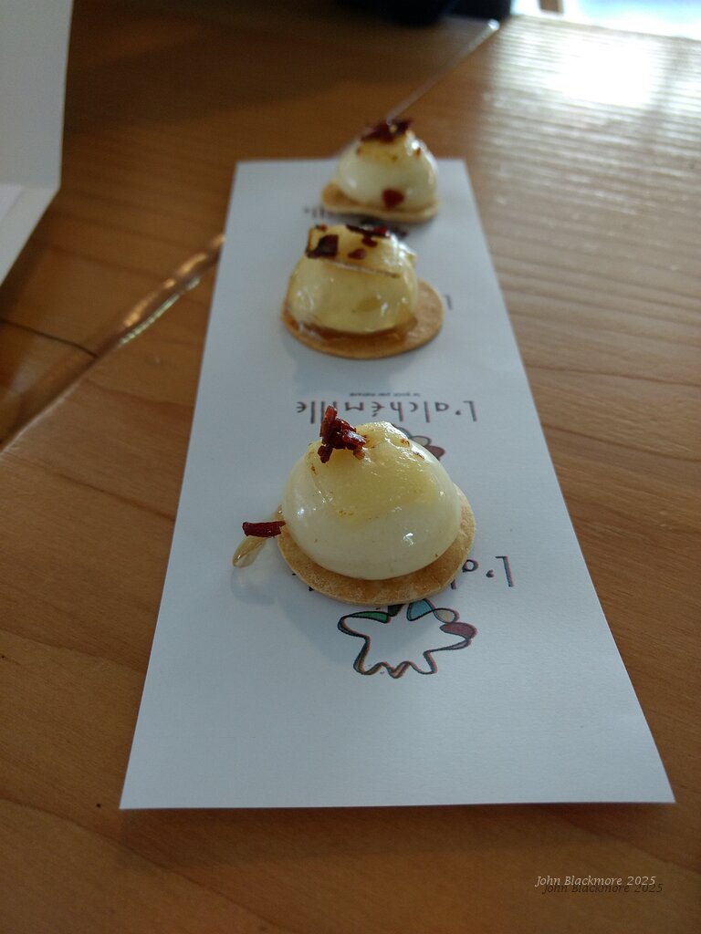 amuse bouche: tarte flambee revisited (bacon on a gelatine shape filled with cream cheese)