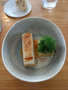 Biscuit de truite (similar to a quenelle mix), mille feuilles de pommes de terre et fenouil des Alpes