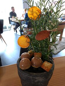 mignardises: carrot discs, sponge biscuits and gelatine shapes filled with rosemary-flavoured chocolate cream (on a rosemary plant)