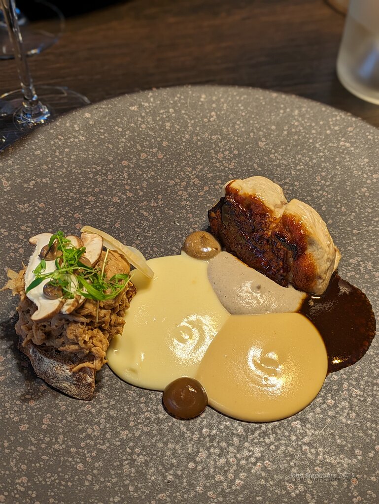 Pintade des Crêtes du Rupt et Échalotes Noires – Topinambour et foin – Champignons – Pain au Levain