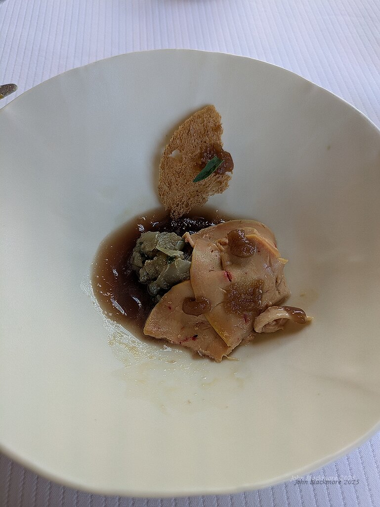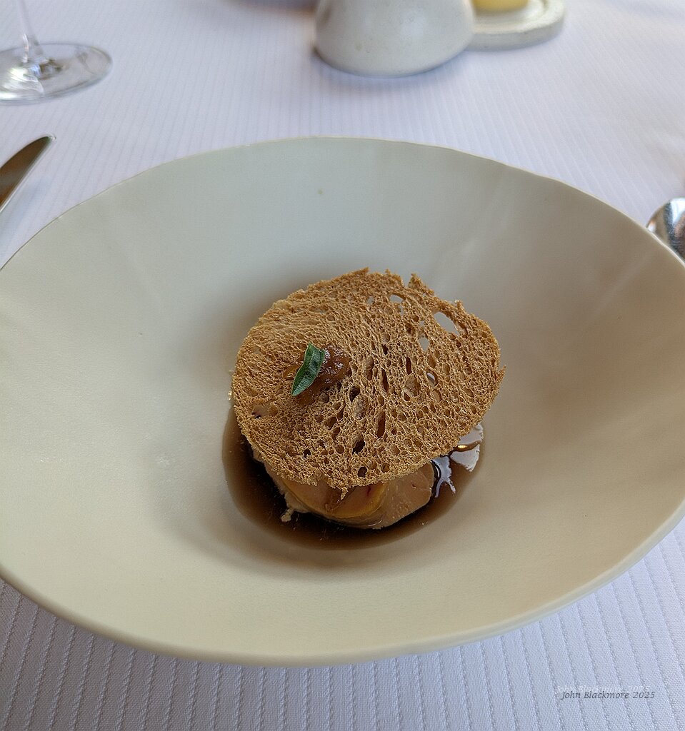 Oignons de Sélestat confits, foie gras de canard cuit au sel, tuile de pain et bouillon de peaux d’oignons rouges