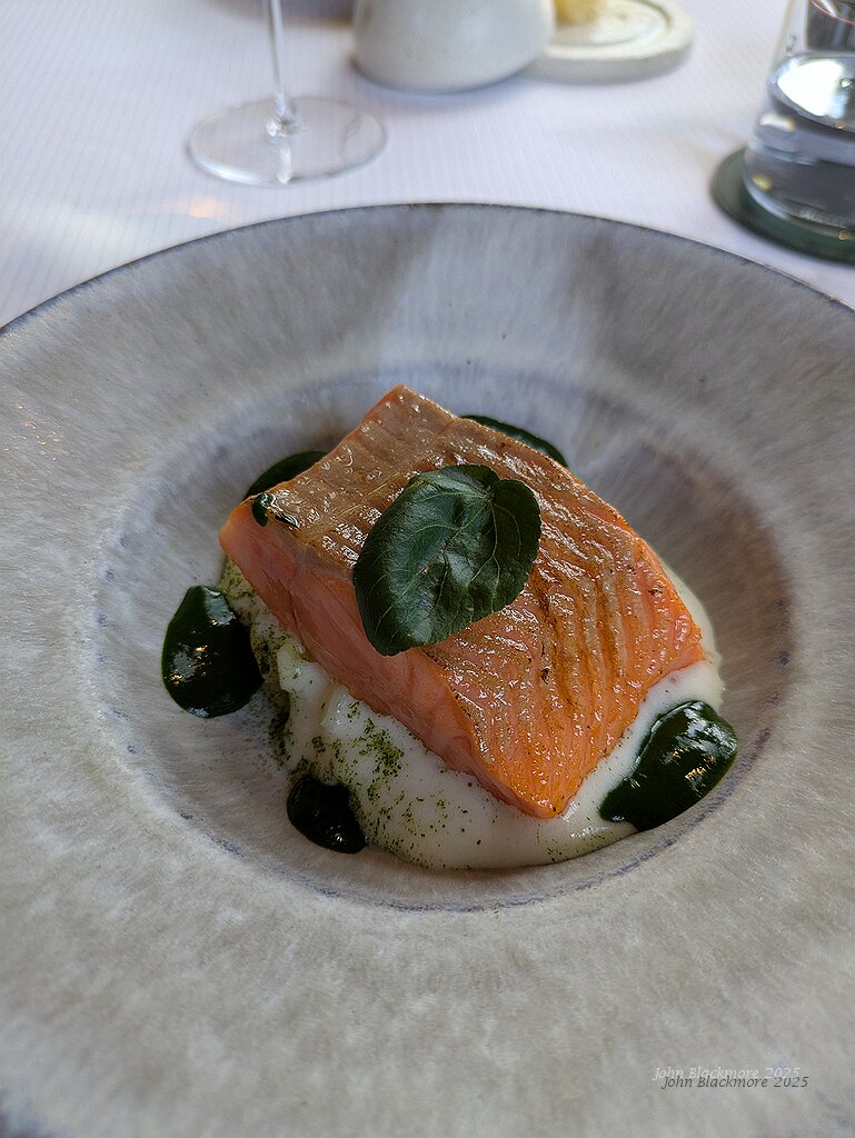 Truite d’Alsace cuite au sel, mousse légére de pommes de terre, jus et condiment de cresson