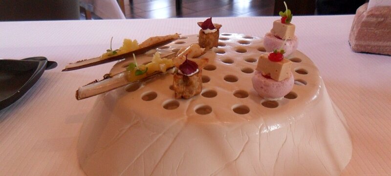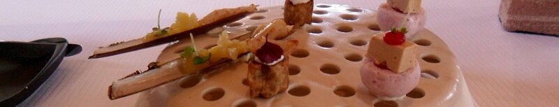 amusettes et broutilles: razor clam with pineapple and yellow beetroot, fried duck, foie gras and meringue