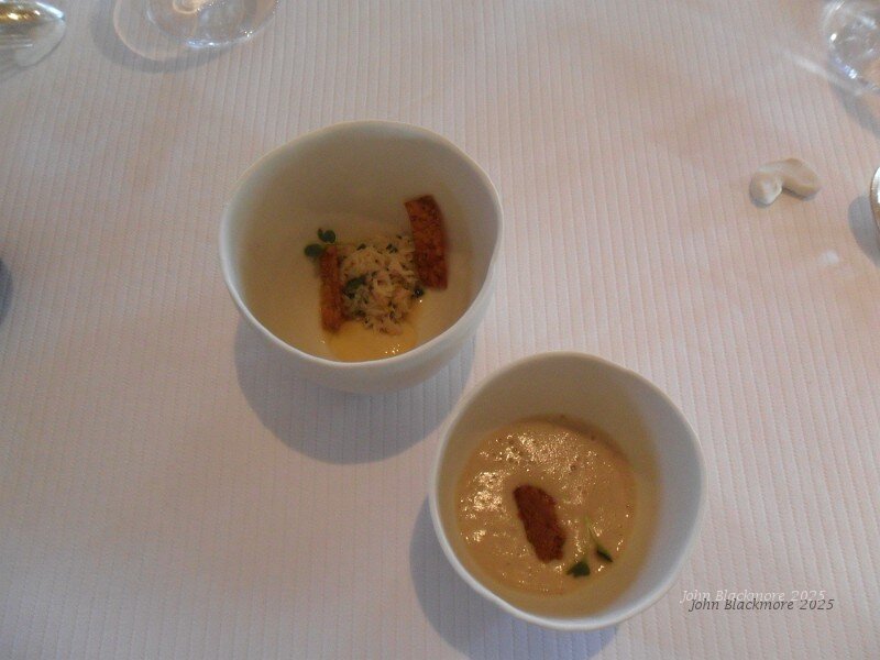 amuse bouche: crab and mayonnaise, and jerusalem artichoke soup with praline