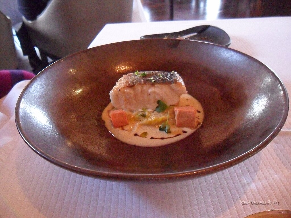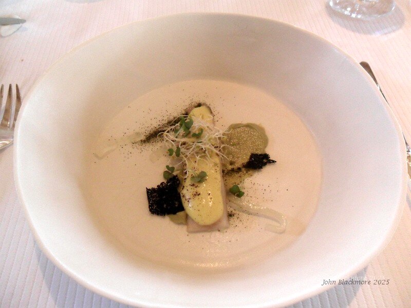 fish: Blanc de poireaux crémeux, huile d'olive et sirop de balsamique, dés de foie gras et colin